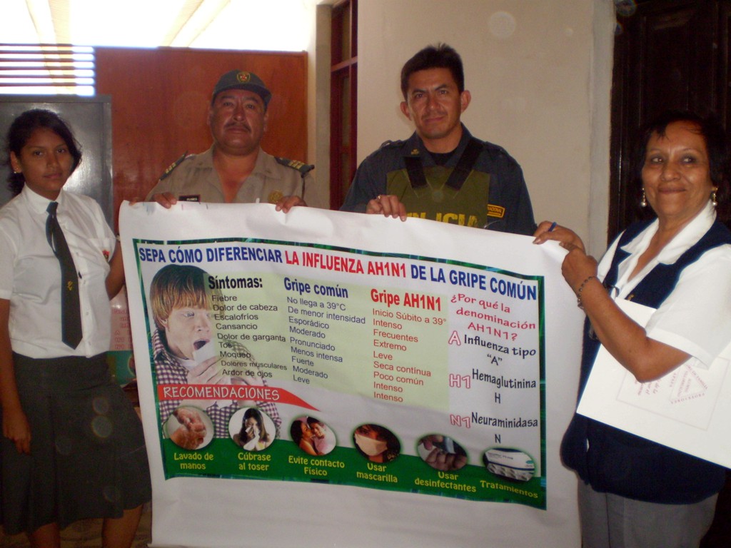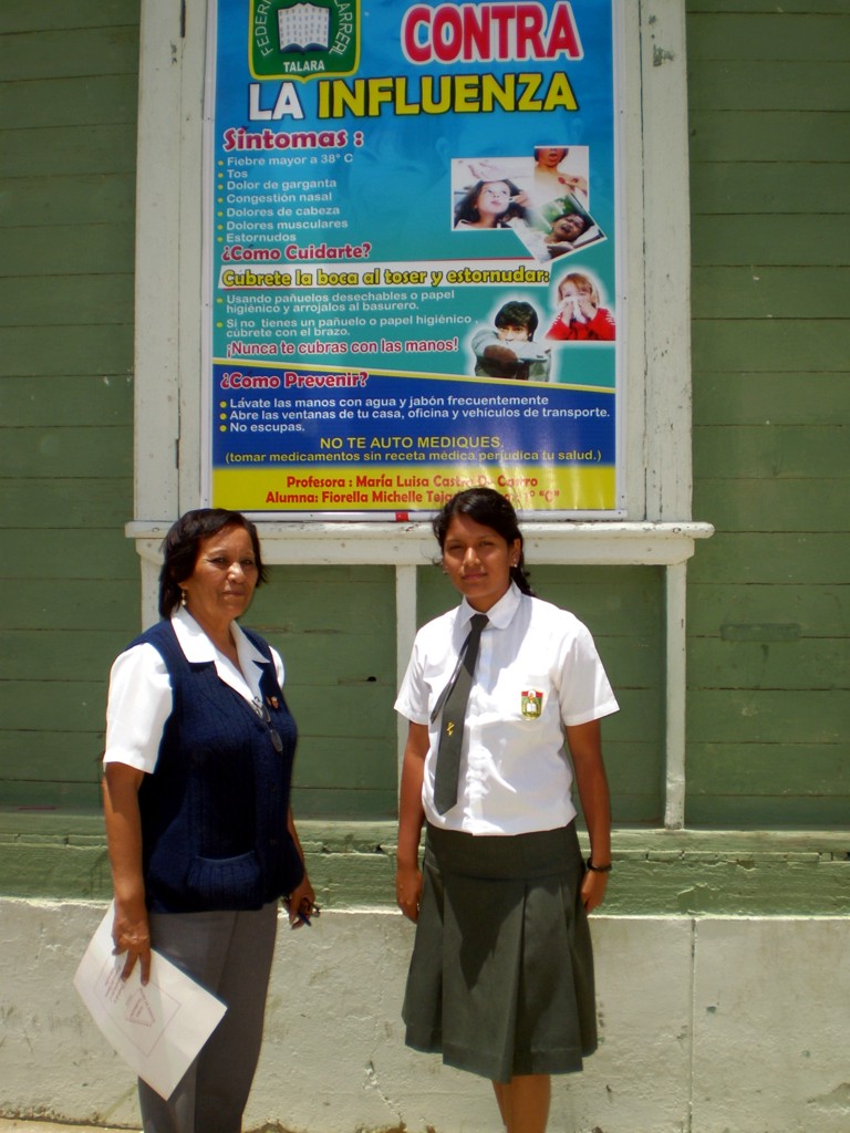 La profesora María Luisa Castro acompañada de una de nuestra destacadas alumnas hicieron entrega al Comandante de la Policía Nacional y a la Dra. Melva Urbina, Directora del Hospital II ESSALUD Talara, de las gigantografías, las que fueron recibidas con mucho agrado. Agradeciendo la labor de difusión y prevención que realiza nuestro colegio.