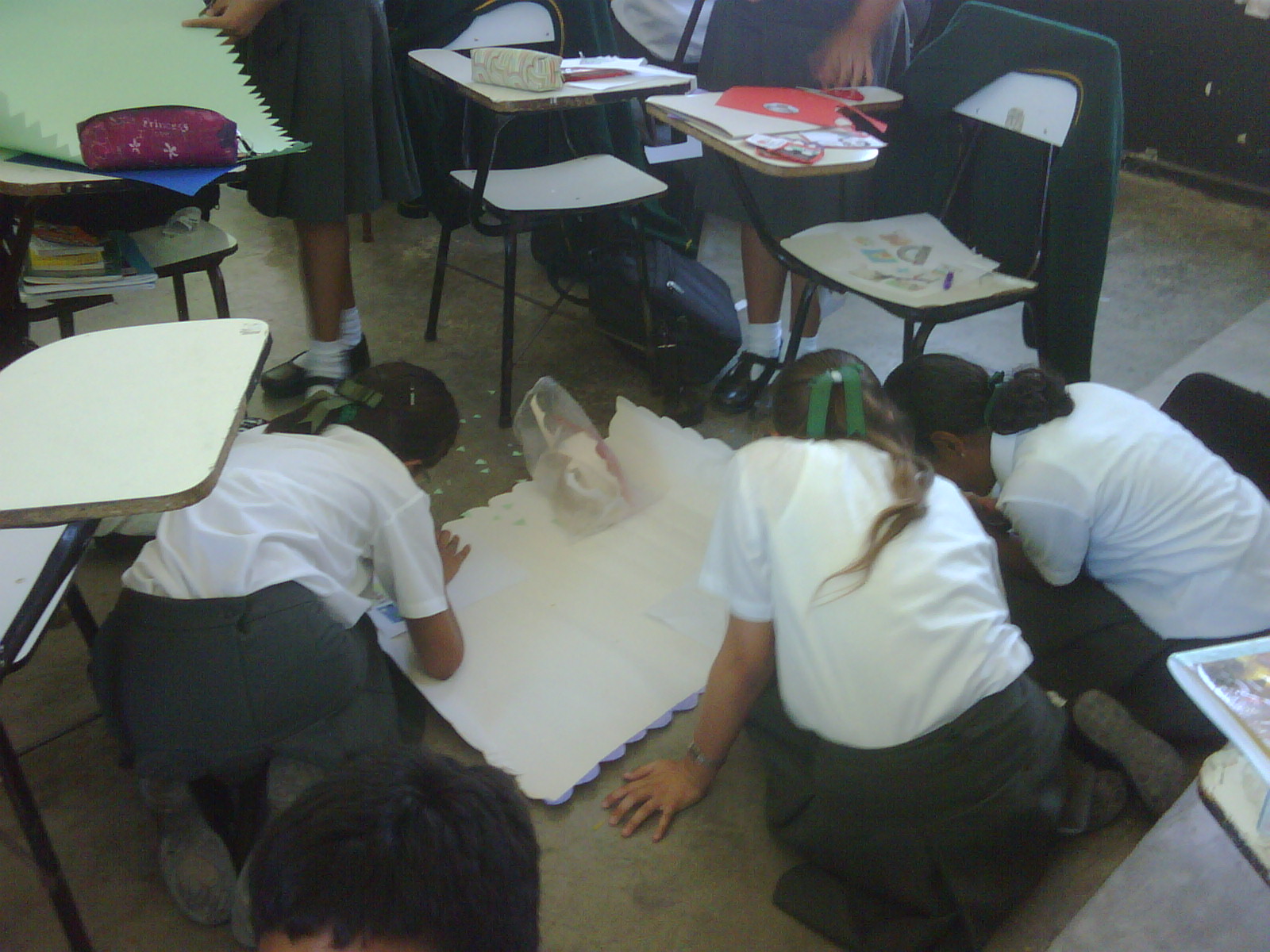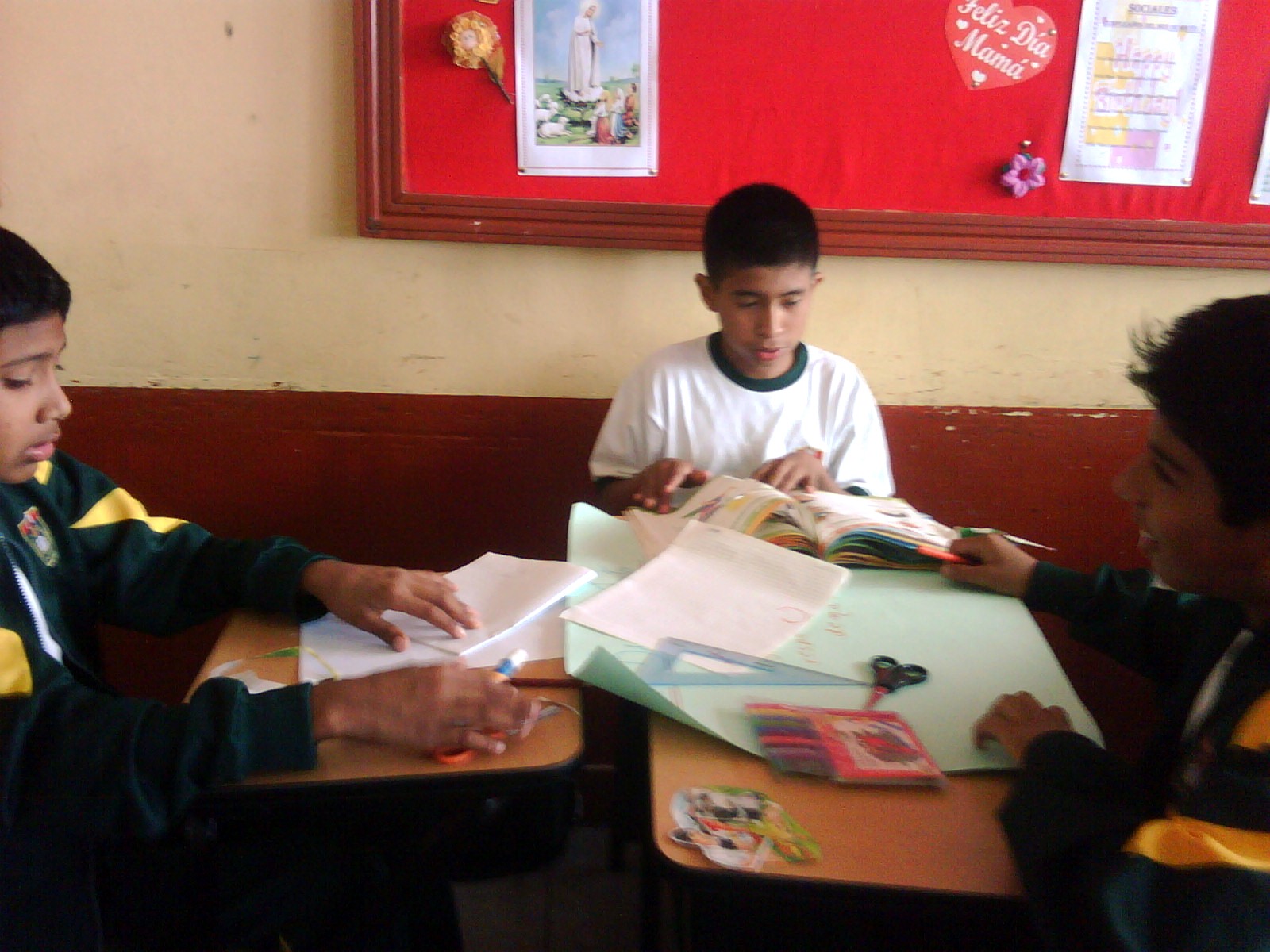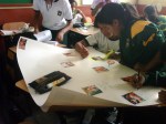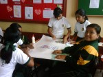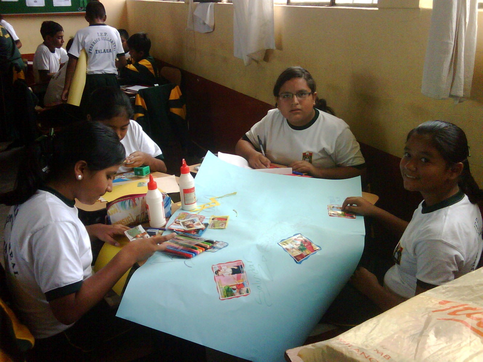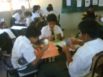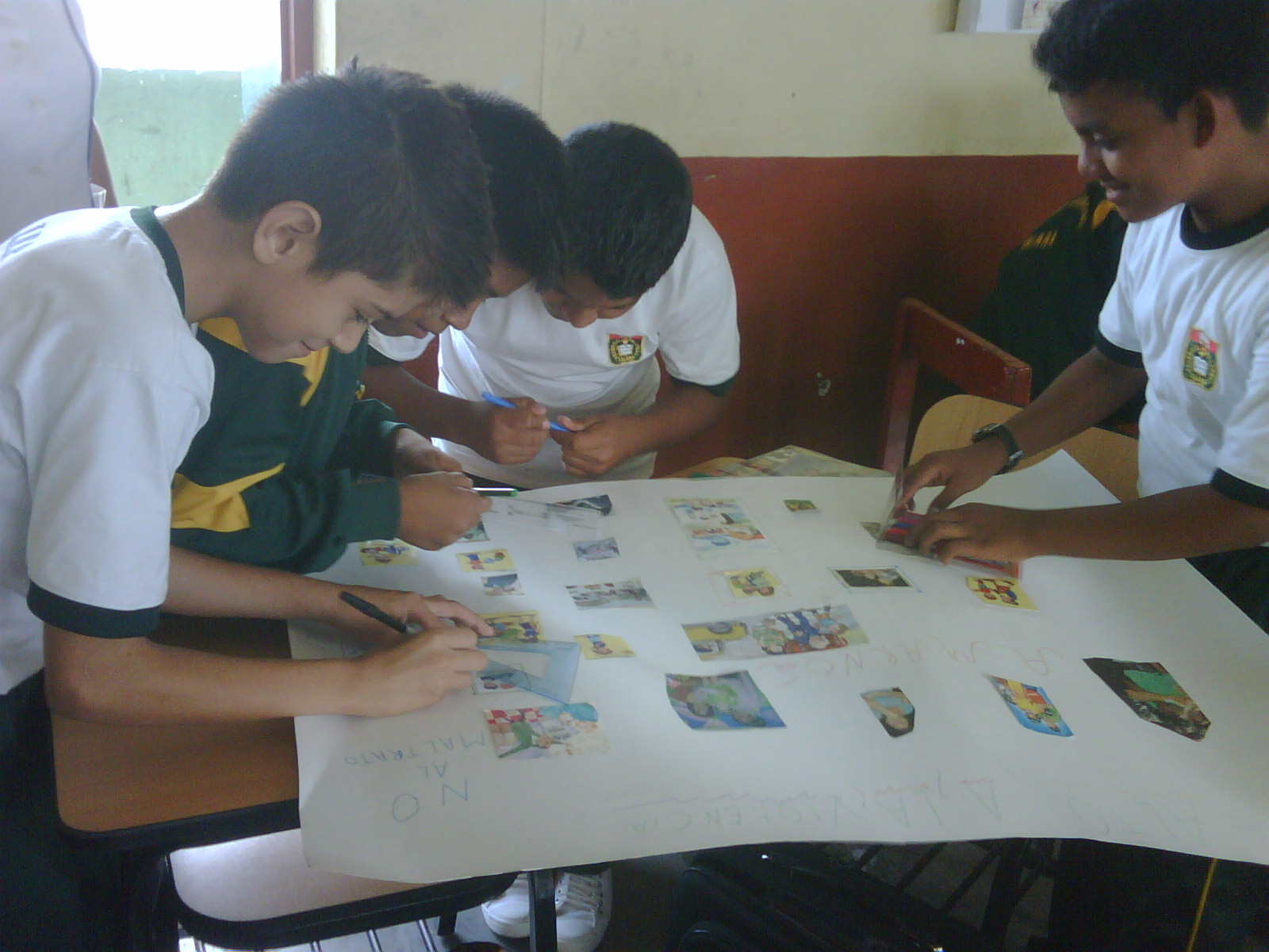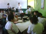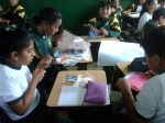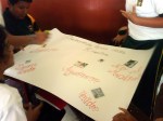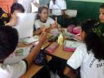 Los alumnos de 2do grado trabajando sus afiches para la campaña Tengo Derecho al Buen trato, acompañados de sus profesores