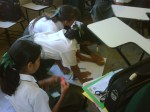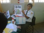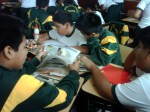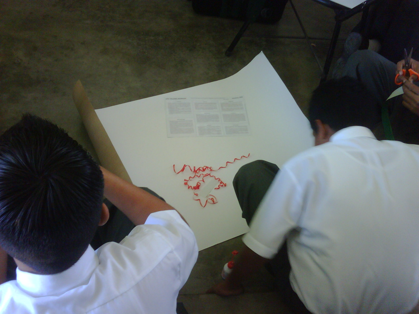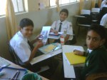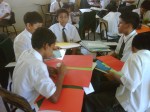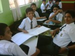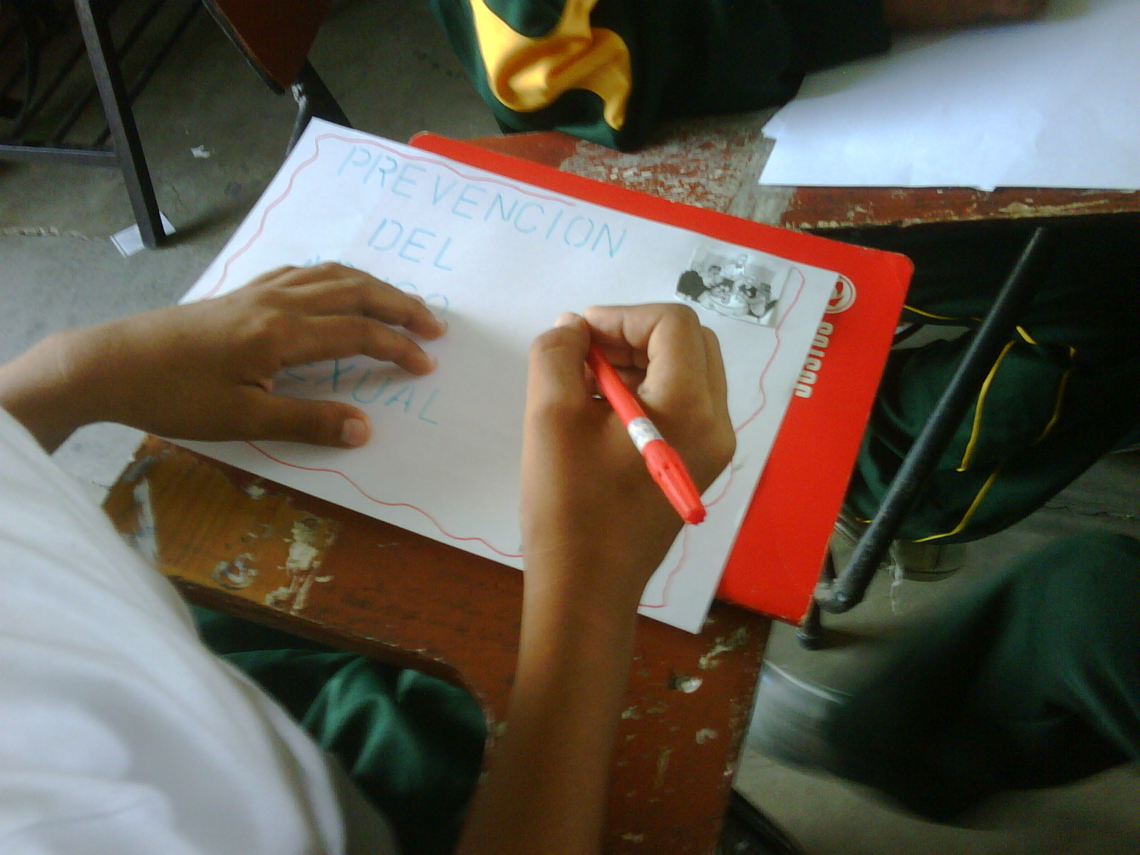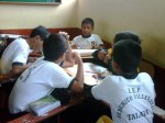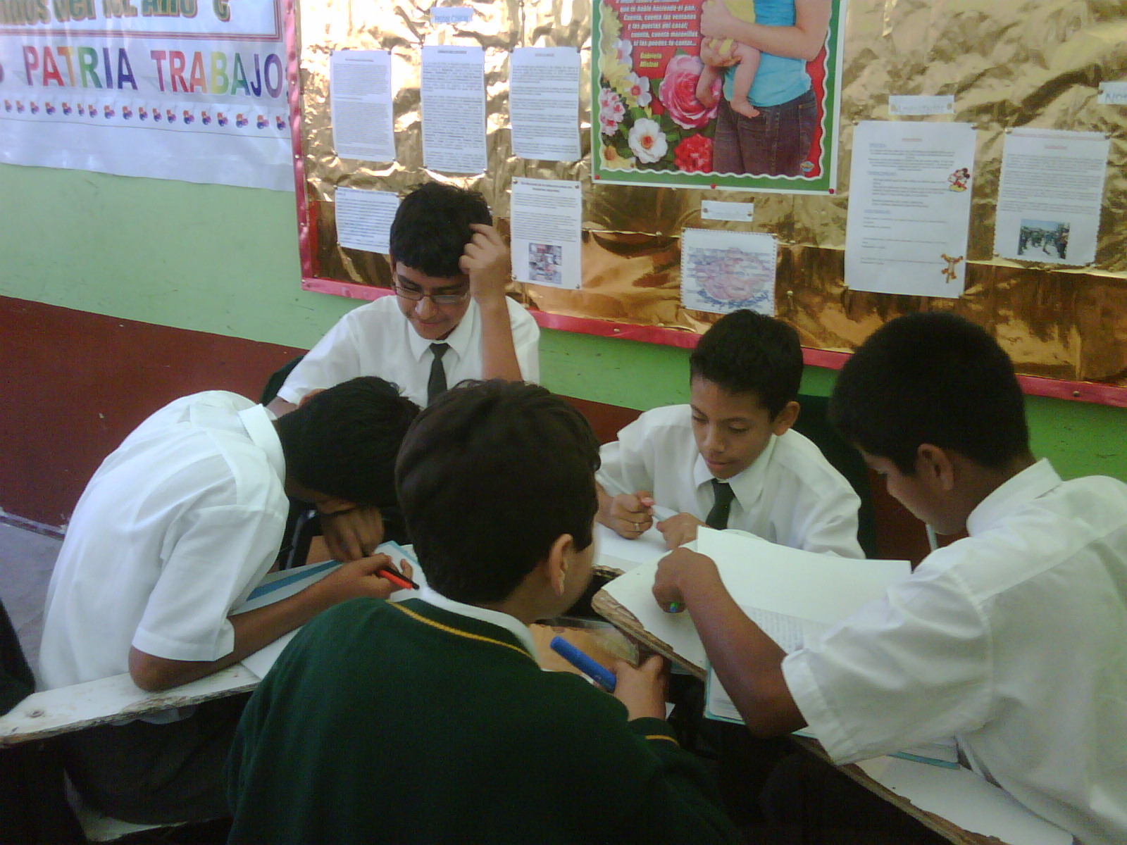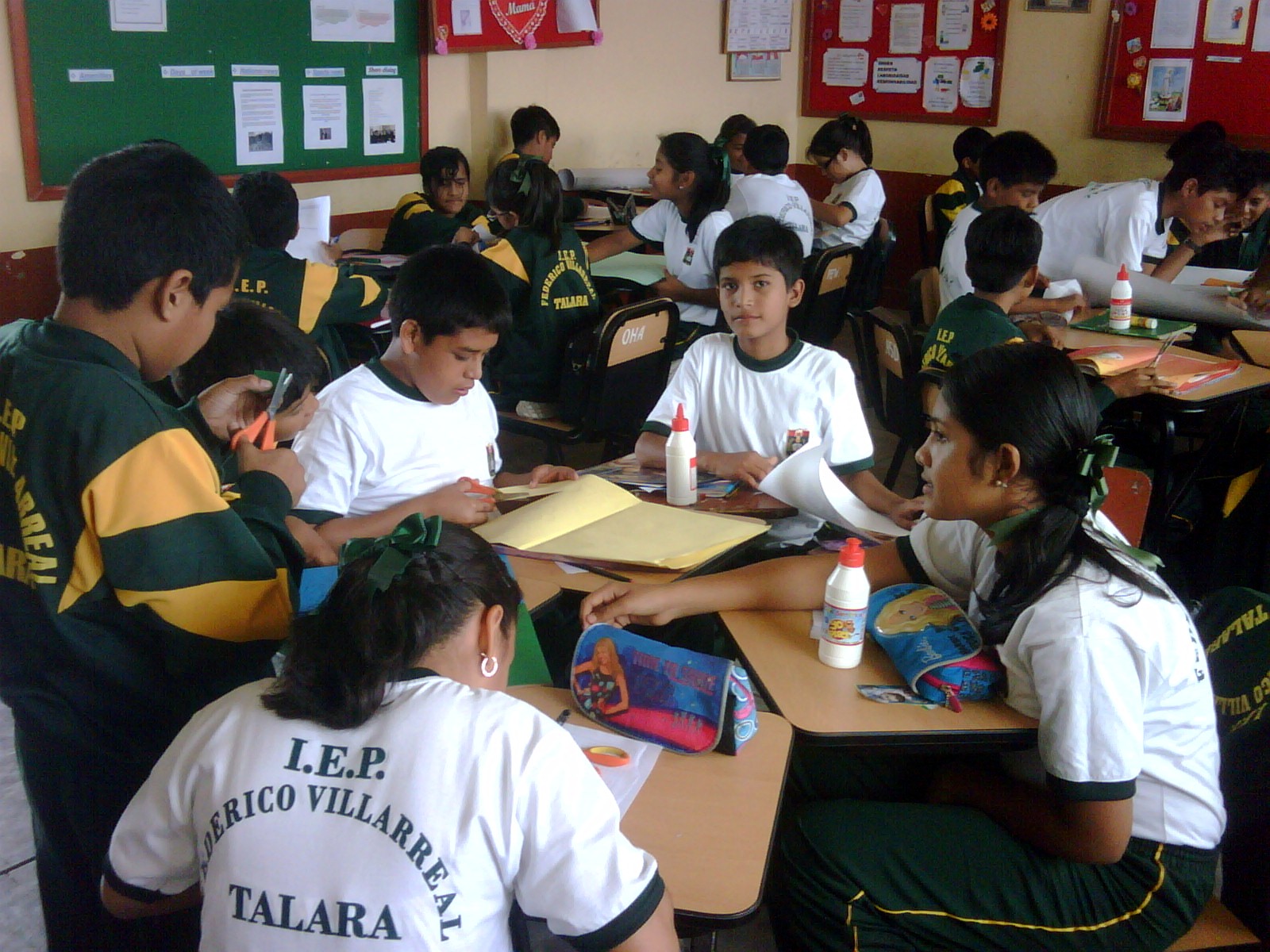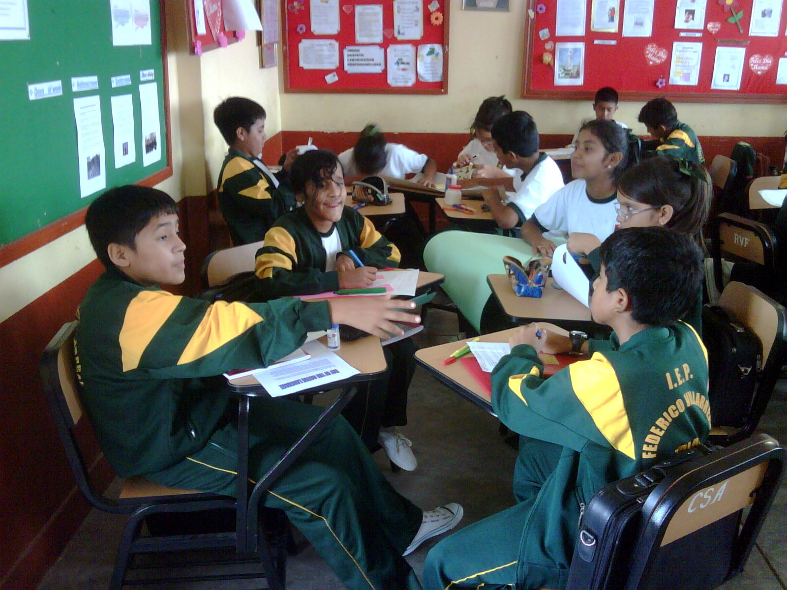 Los alumnos de 2do grado trabajando sus afiches para la campaña Tengo Derecho al Buen trato, acompañados de sus profesores
