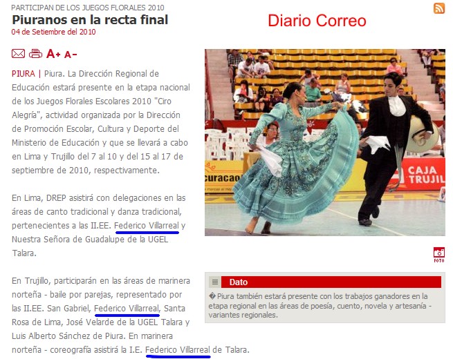 El diario Correo de Piura destaca la participación y representación del Colegio Federico Villarreal en los Juegos Escolares. LIDER EN TALARA.