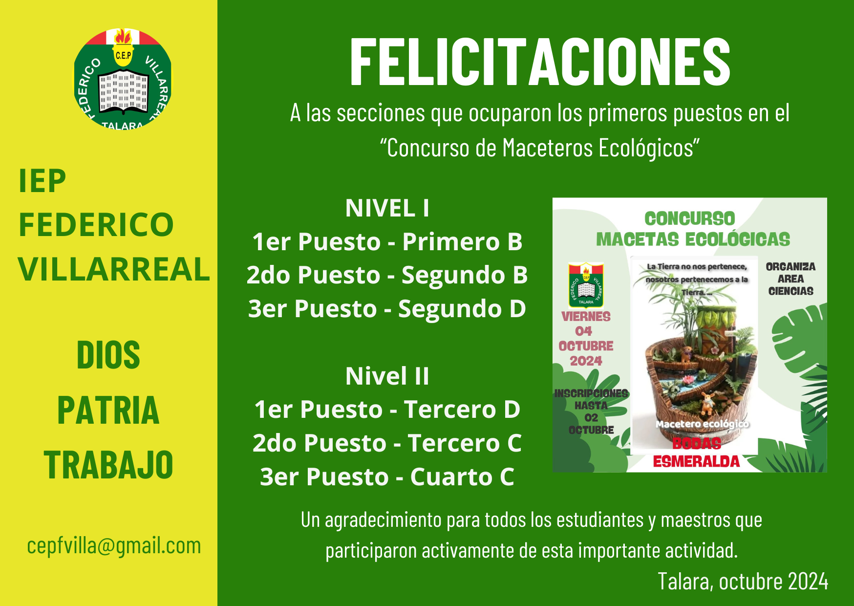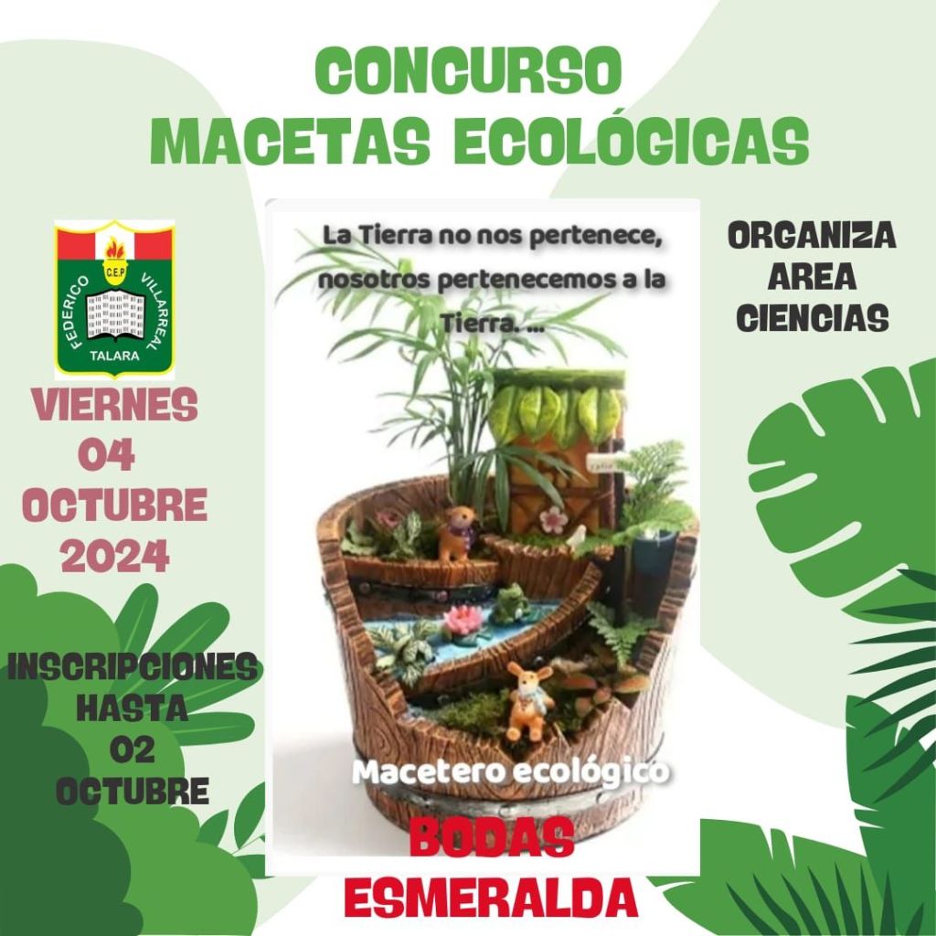 El día de hoy viernes 4 de octubre, se llevó a cabo el Concurso de Maceteros Ecológicos, organizado por el Área de Ciencias de nuestra Institución Educativa.